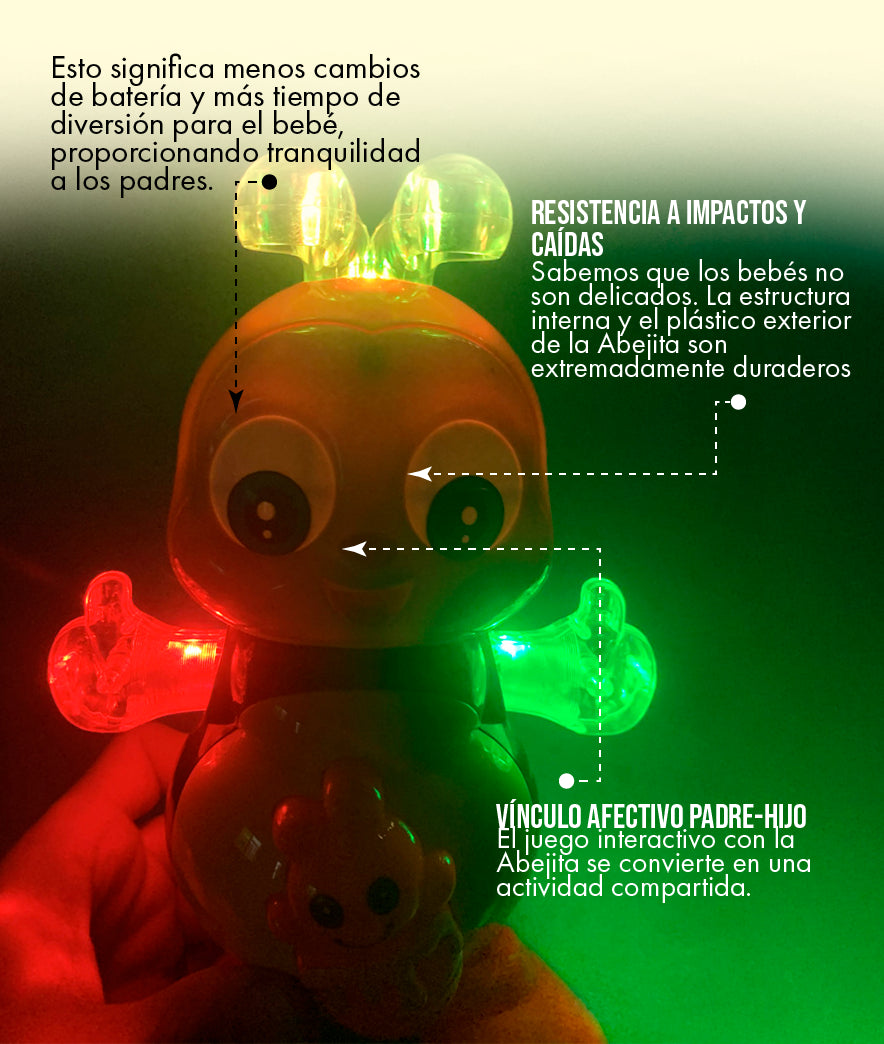 de las Abejitas han superado nuestras pruebas de caída de 1.5 metros sin sufrir daños funcionales. Fabricada con nuestro plástico ABS de alta resistencia, esta estadística es su garantía de durabilidad. No importa cuántas veces sea lanzada o golpeada, la Abejita seguirá bailando, demostrando que su inversión es a prueba de niños.