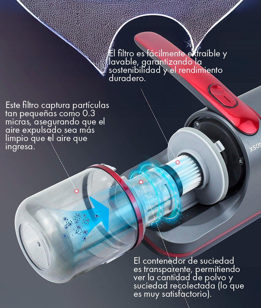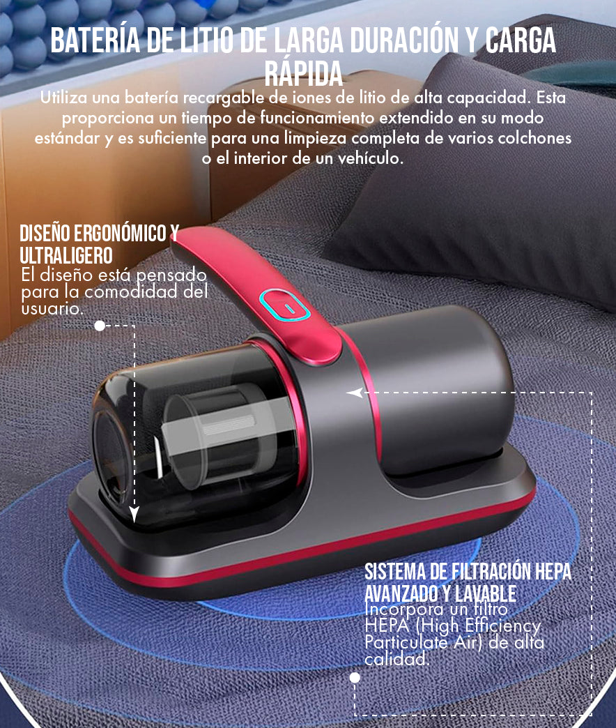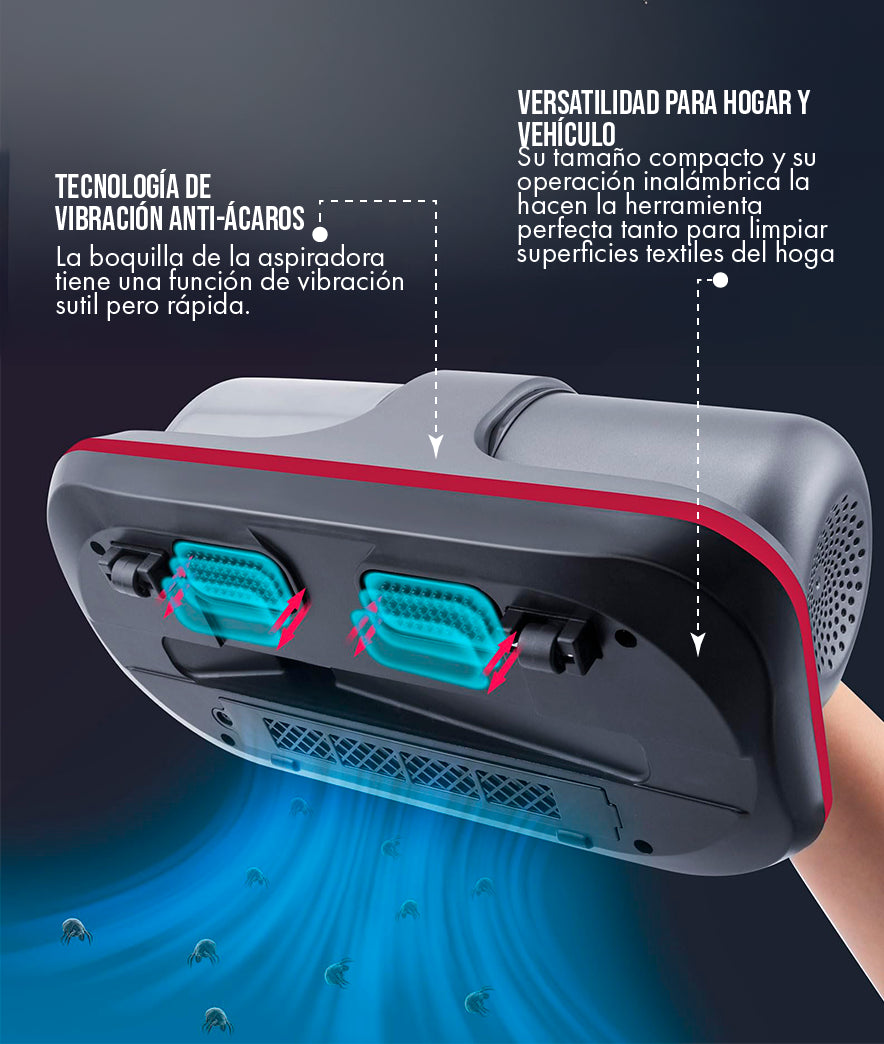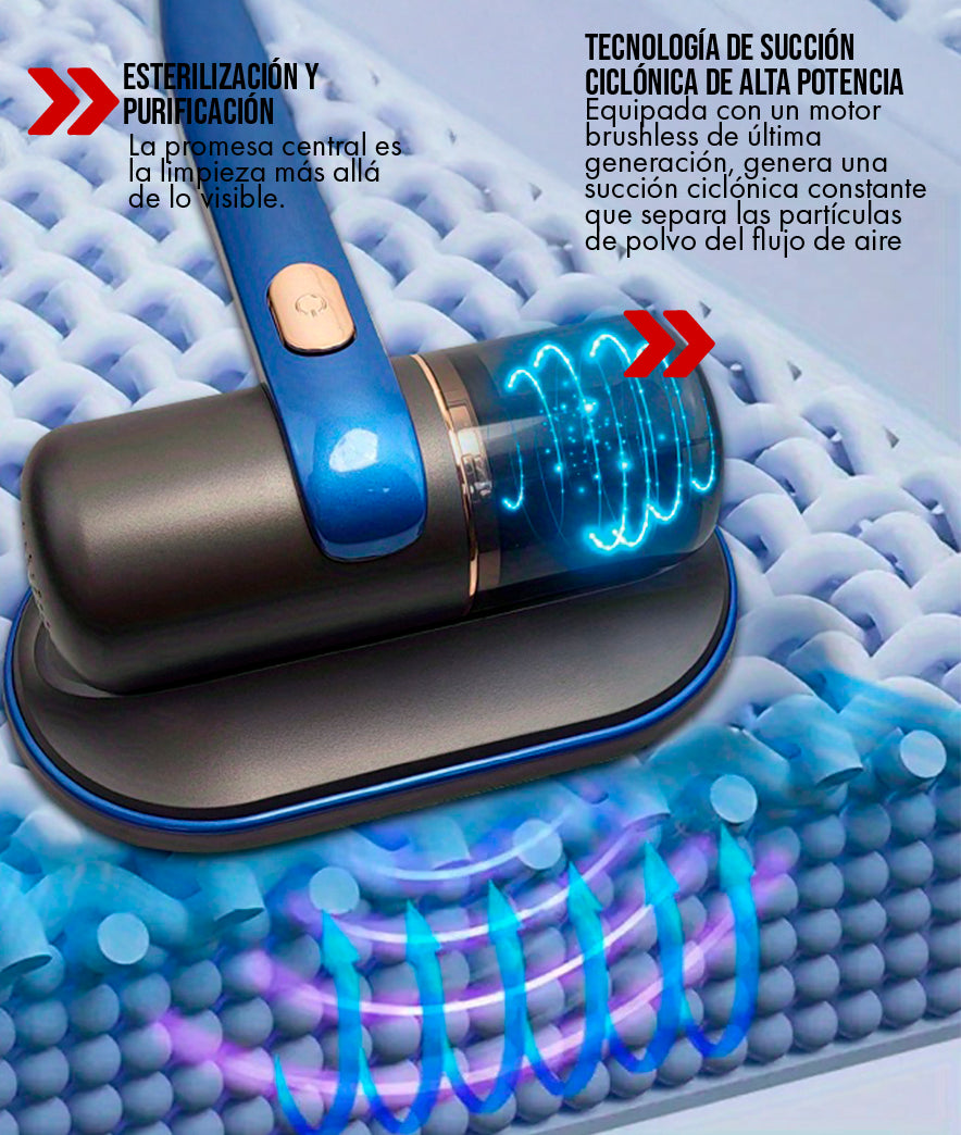 La aspiradora está equipada con un motor brushless (sin escobillas) de alto rendimiento, que genera una succión ciclónica constante y superior a la de los modelos de mano convencionales. Para la extracción de ácaros y polvo incrustado, la ISTERILIZE PRO™ incorpora una función de vibración de alta frecuencia en el cabezal. Esta vibración golpea suavemente las fibras del tejido, forzando a las partículas más profundas a ascender a la superficie, donde la succión ciclónica las captura con facilidad. Sí, está diseñada específicamente para la limpieza profunda de tapicería.
