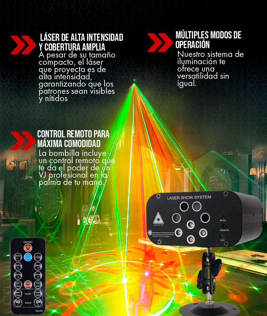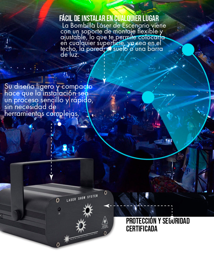 Un evento sin luces dinámicas es como una canción sin melodía. Nuestra bombilla láser es la pieza que falta en tu rompecabezas. Proyecta una sinfonía de luz que se mueve, baila y vibra con la música, elevando la energía de todos los presentes y creando un ambiente que los hará querer bailar toda la noche.