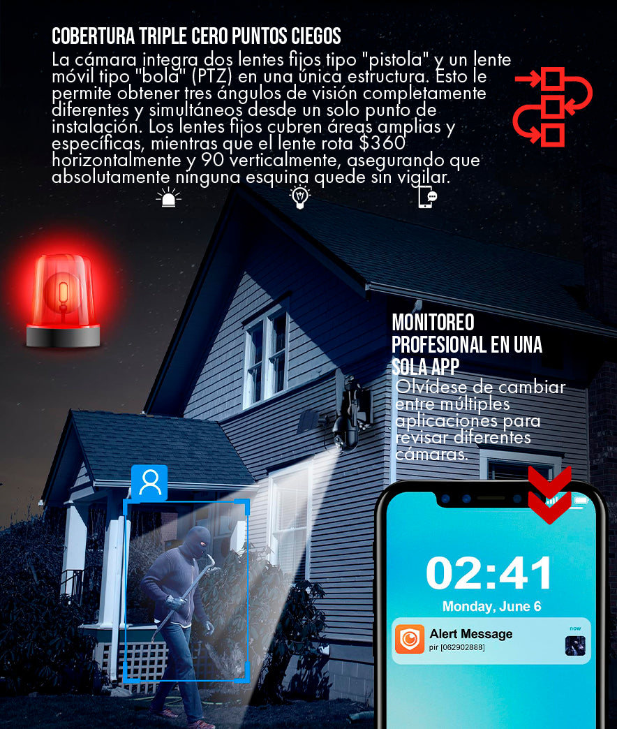 La clave está en su diseño de lente múltiple. Integra dos lentes de ángulo fijo, estratégicamente orientados para cubrir las áreas perimetrales críticas, y un tercer lente PTZ (Pan-Tilt-Zoom). Los dos lentes fijos le dan la visión panorámica constante. El lente PTZ tiene la capacidad de rotar e inclinarse para seguir el movimiento o patrullar rutas predefinidas. La aplicación muestra estos tres videos en una única pantalla dividida, lo que garantiza una cobertura ininterrumpida y completa desde una sola instalación, eliminando efectivamente los espacios sin vigilancia.
