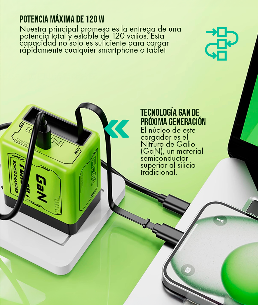 de las unidades vendidas son adquiridas por personas que buscan reemplazar su cargador de laptop original debido a su tamaño o peso. El Cargador GaN de 120 W ha demostrado ser una alternativa superior, ofreciendo la misma o más potencia que los cargadores OEM (Original Equipment Manufacturer), pero en un diseño hasta un 50% más pequeño y con la ventaja adicional de la carga dual.