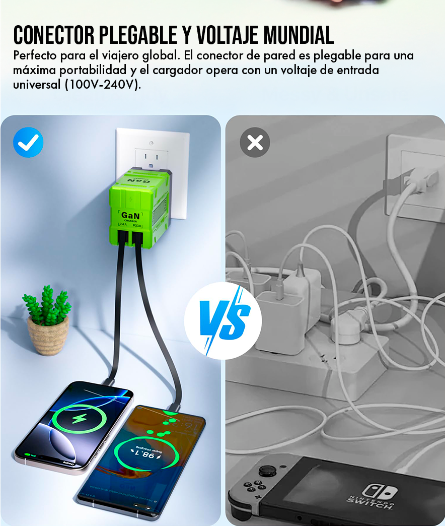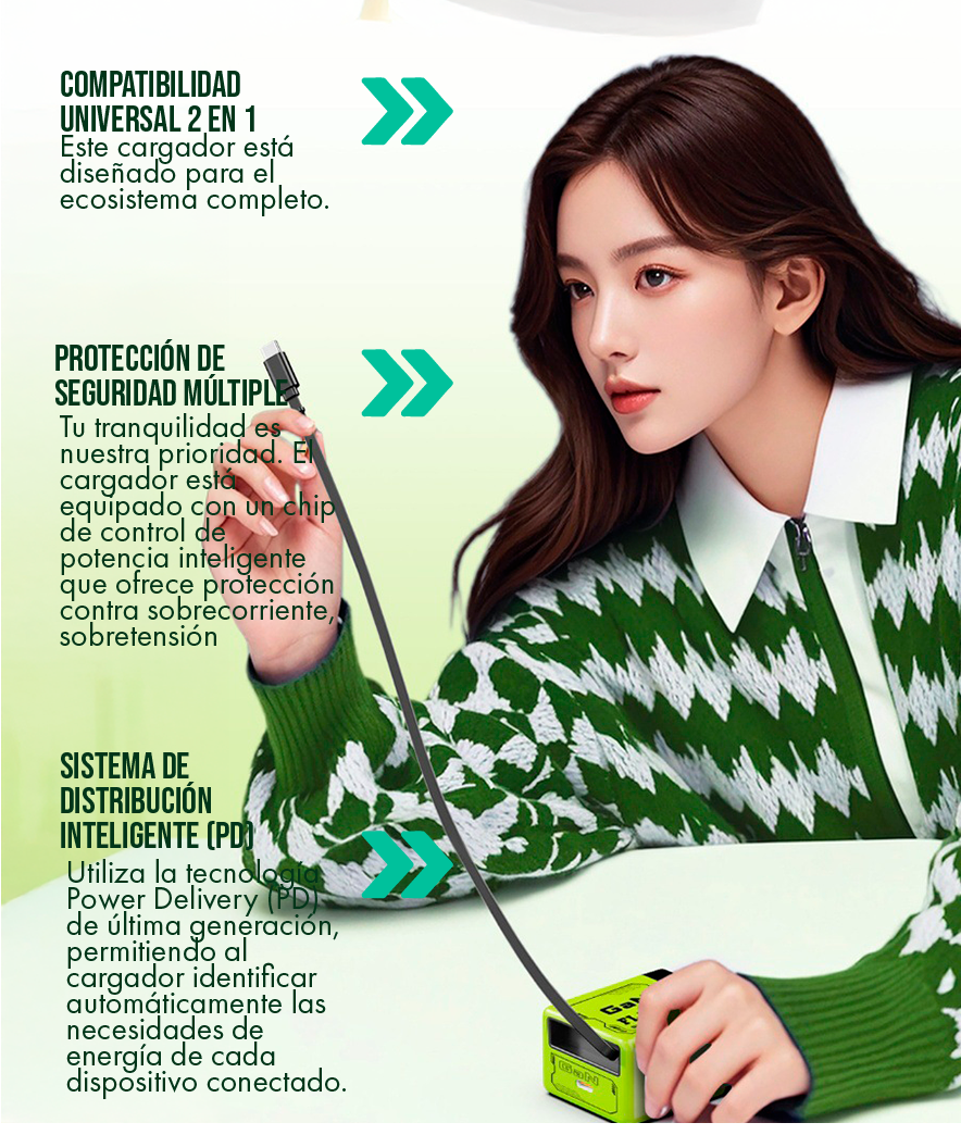 de nuestros usuarios confirmaron que el Cargador GaN 2 en 1 redujo el tiempo total de carga de su "kit tecnológico" diario (laptop y smartphone) en un promedio del 40%. Esta aceleración no es solo un número; es el tiempo de vida que recuperas, permitiéndote ser más productivo y dedicar menos tiempo a esperar.