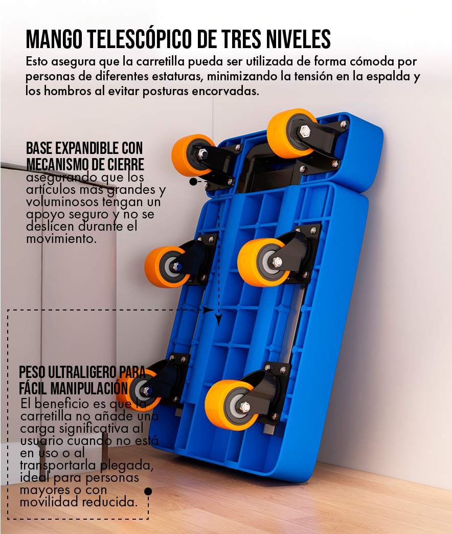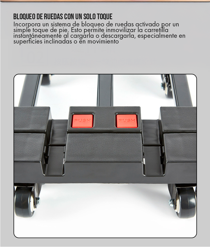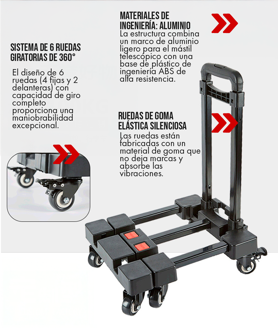 El sistema de 6 ruedas (la mayoría de las cuales son giratorias 360°) está diseñado para maximizar la estabilidad y la maniobrabilidad en superficies planas o ligeramente irregulares. Aunque no es una carretilla de oruga, su diseño de ruedas múltiples y el material de goma elástica le permiten sortear pequeños obstáculos con mayor suavidad y silencio que las carretillas de 4 ruedas. Para subir escaleras, se recomienda levantar la carga, pero el diseño de la base ofrece un punto de apoyo seguro.