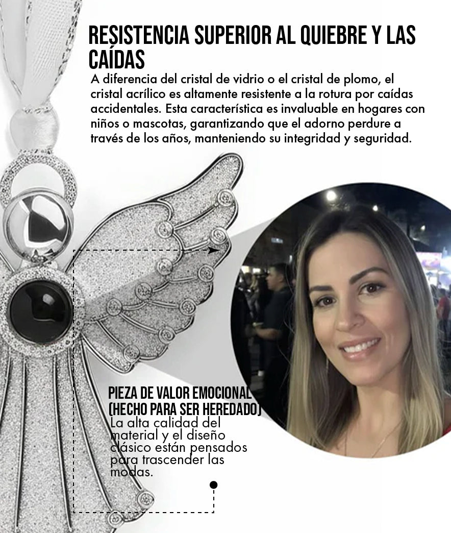 Nuestro Colgante de Ángel está hecho de un cristal acrílico de alta densidad, también conocido como plexiglás de grado óptico. NO es vidrio frágil. La diferencia clave es que, aunque el vidrio puede ser más pesado, nuestro acrílico ha sido facetado con precisión óptica para lograr una refracción de luz superior, lo que se traduce en un brillo más vivo y más destellos de arcoíris que el vidrio común, pero con la ventaja crucial de ser resistente a las caídas.