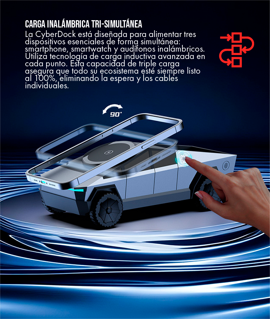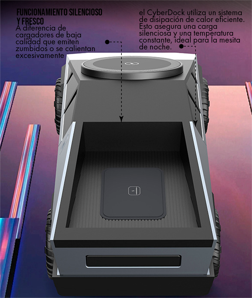 de nuestros clientes reportaron una eliminación completa de la "maraña de cables" de su mesita de noche gracias al CyberDock. Este cargador es la solución definitiva al desorden digital. Con un solo punto de alimentación, usted elimina la necesidad de tres o más cables individuales y enchufes, lo que resulta en un entorno más limpio y visualmente relajante.