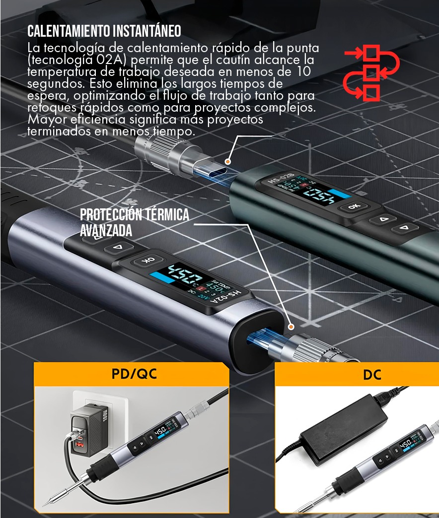 Sí, gracias a que el elemento calefactor está integrado directamente en la punta (tecnología 02A), la transferencia de calor es prácticamente instantánea y extremadamente eficiente. La velocidad de calentamiento está optimizada para el uso portátil y profesional, permitiéndole empezar a soldar casi de inmediato. Esto es una de las mayores ventajas sobre cautines tradicionales con resistencias externas.