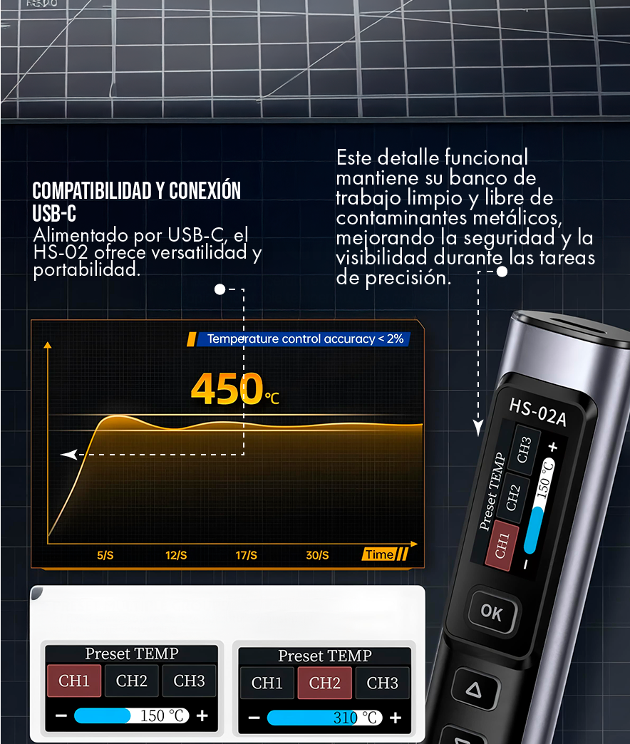 La frustración de fallar un punto de soldadura por la inestabilidad de su cautín es cosa del pasado. El HS-02 le da el control termal exacto para que su habilidad brille, garantizando que el único límite en su trabajo sea su imaginación, no su equipo. ¡Su maestría merece herramientas de precisión!