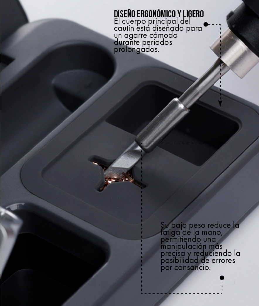 La combinación del calentamiento ultrarrápido (menos de 10 segundos) y el diseño todo en uno que elimina el desorden y la búsqueda de herramientas, permite un flujo de trabajo constante y sin interrupciones, disparando la productividad en el banco de trabajo.
