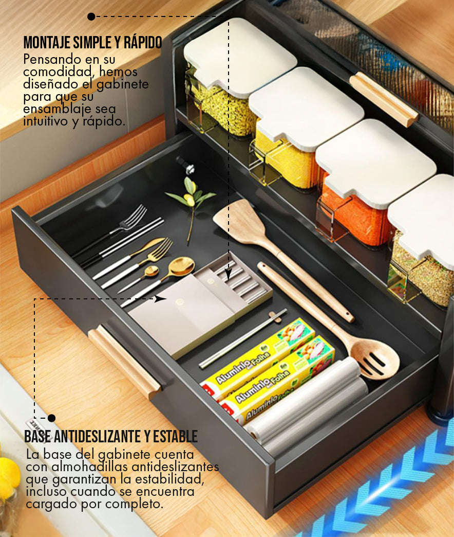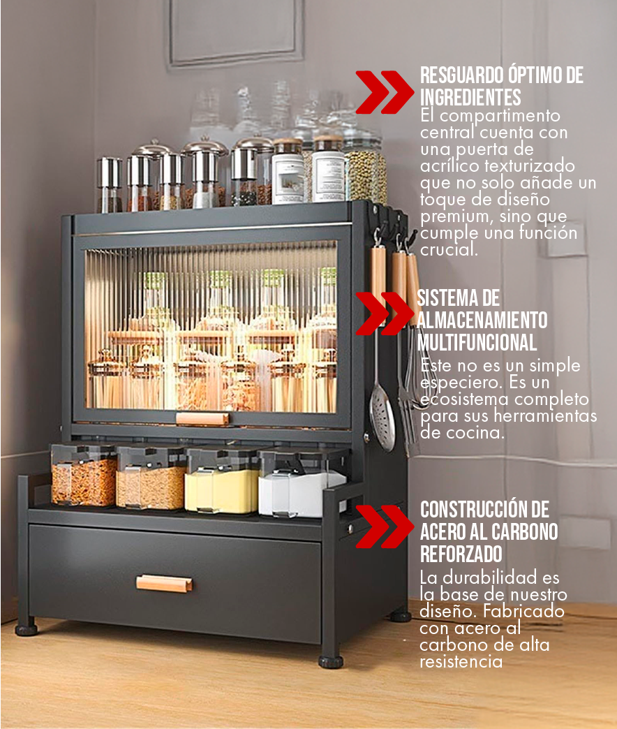 El acto de cocinar debe ser una terapia, no una tarea estresante. Cuando su encimera está abarrotada y su tiempo se gasta buscando el comino en lugar de sazonar, su pasión se apaga. Nuestro gabinete elimina el desorden, devolviéndole la fluidez y la alegría a cada plato. Recupere la inspiración, recupere su cocina.
