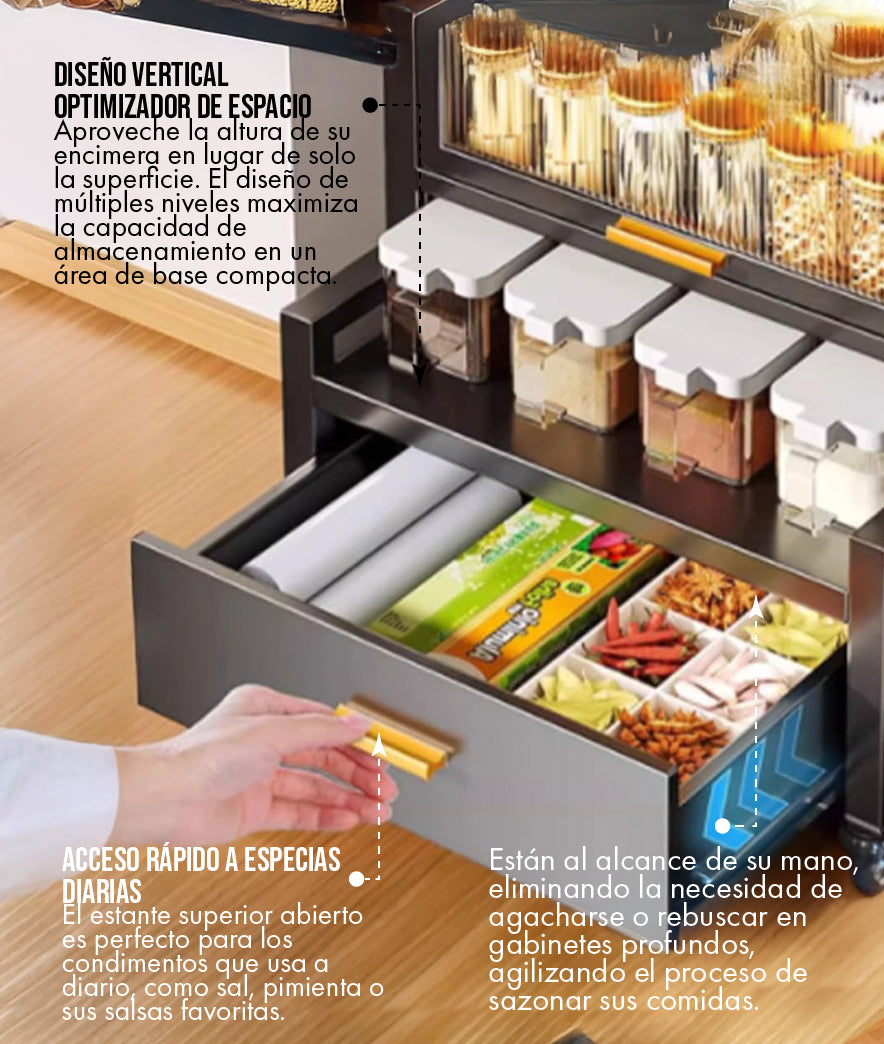 Usted invierte en ingredientes de alta calidad para darle a su familia lo mejor, pero la luz directa es el enemigo silencioso de los aceites y las especias. El compartimento central cerrado actúa como un escudo protector, preservando la integridad de sus sabores, garantizando que cada gota y pizca sea tan perfecta como el día que la compró.