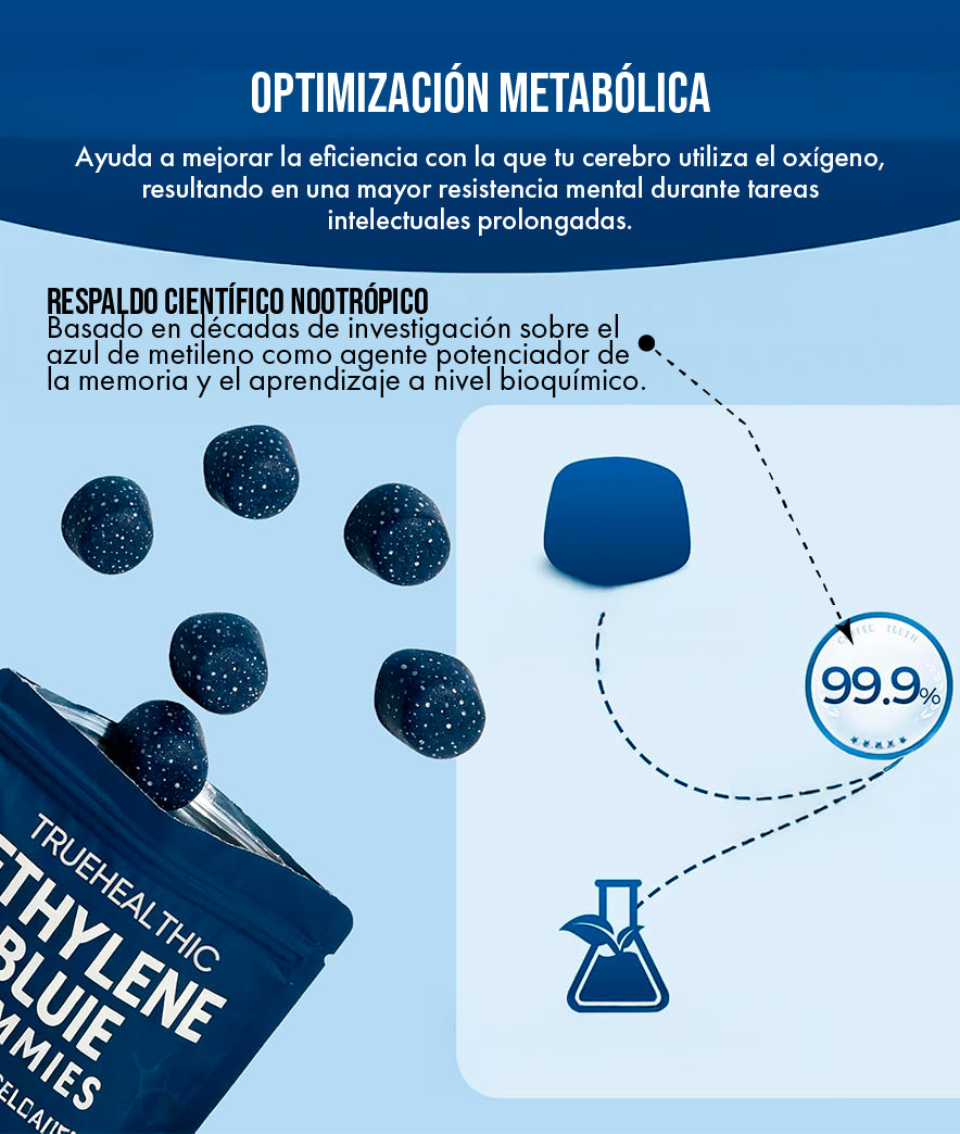 El azul de metileno mejora la respiración celular al actuar como un transportador de electrones en las mitocondrias, lo que aumenta la producción de ATP (energía) en el cerebro, resultando en mayor claridad y enfoque.