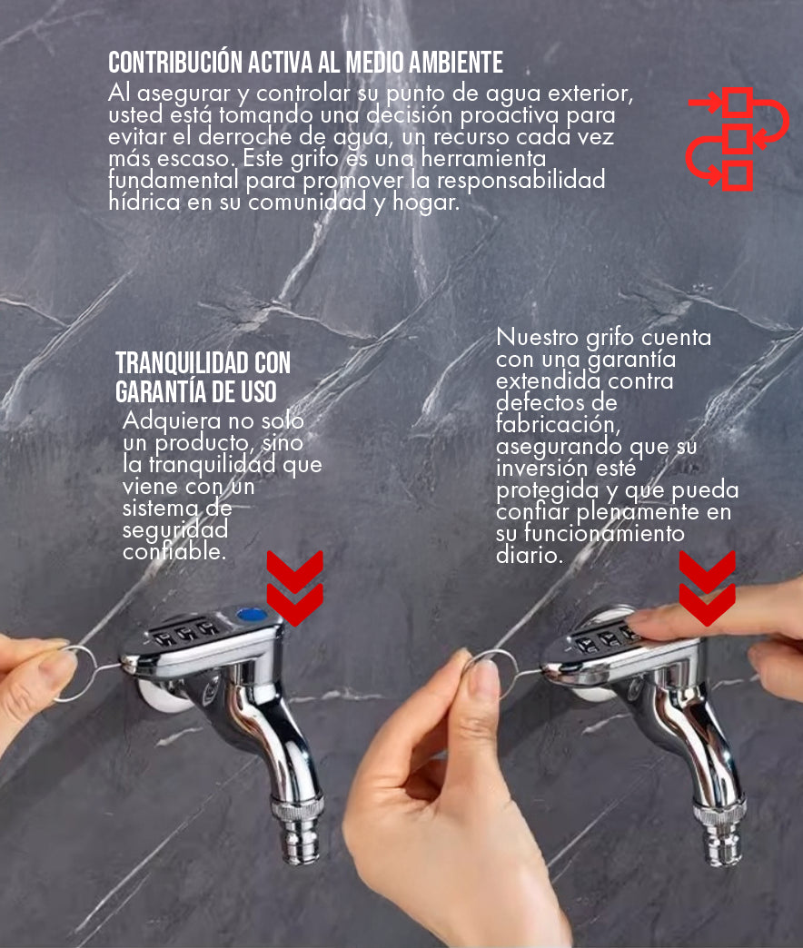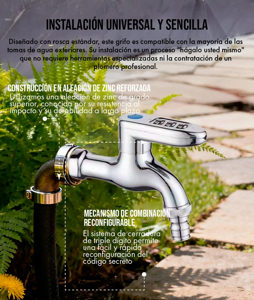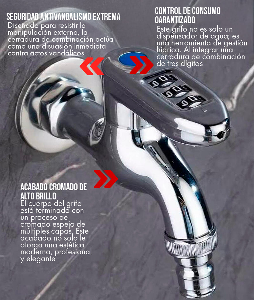 El sistema está diseñado para ser seguro y robusto. No existe una "llave de emergencia" externa, lo que garantiza que solo usted, el usuario, conozca el código. Le recomendamos encarecidamente anotar su combinación y guardarla en un lugar seguro (por ejemplo, en una nota en su celular o en su caja de seguridad). El mecanismo está diseñado para evitar manipulaciones, por lo que una vez que olvide la combinación, la única forma de acceso sería la remoción profesional del grifo.