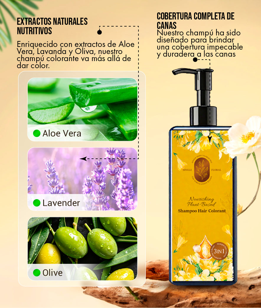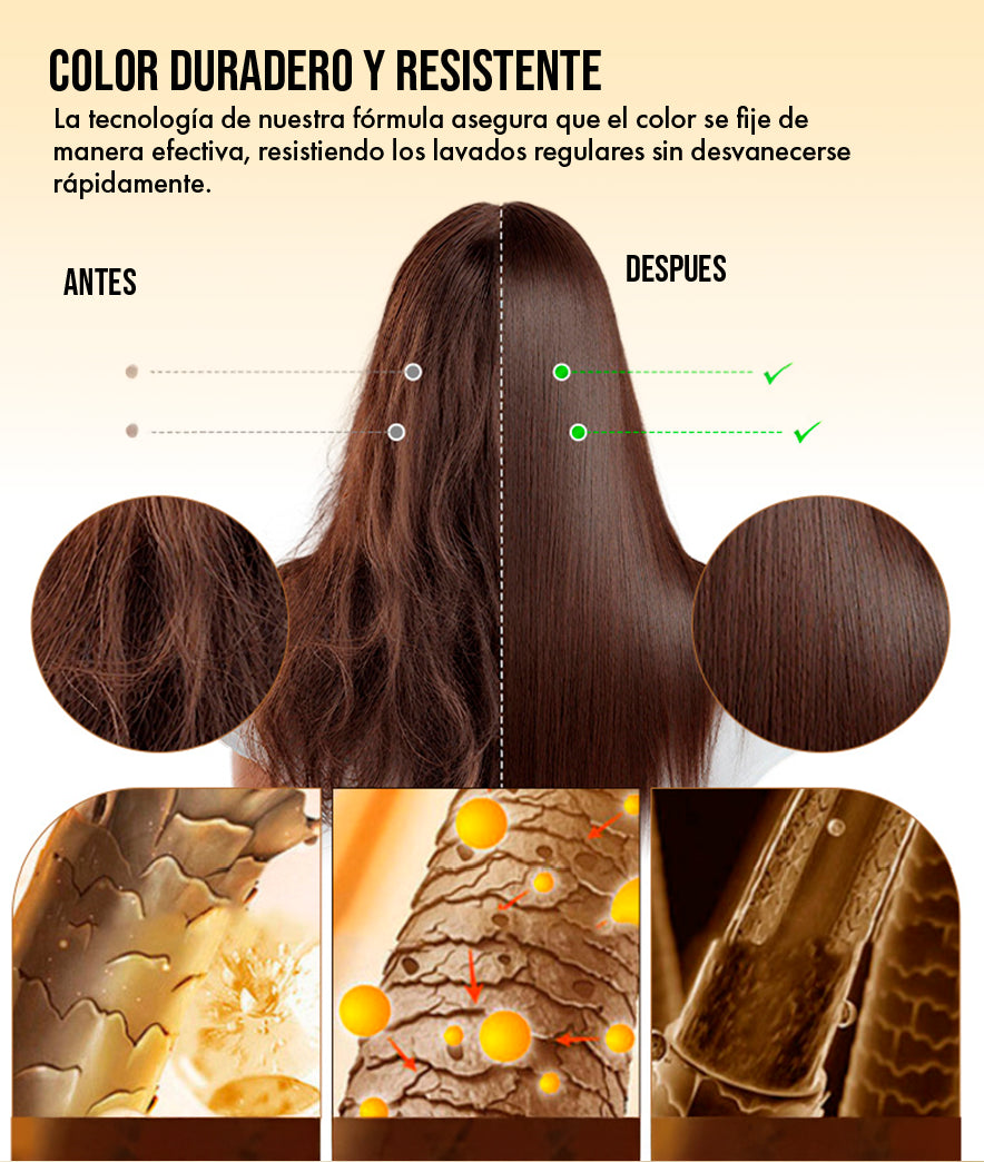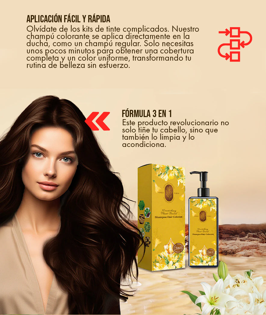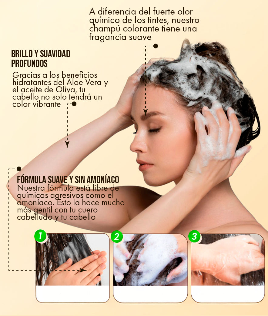 Nuestro champú colorante funciona como un champú y un tinte al mismo tiempo. Al masajearlo sobre el cabello húmedo, los agentes colorantes, derivados de extractos vegetales, se adhieren a la cutícula capilar. El tiempo de aplicación y enjuague es similar al de un champú regular, permitiendo que el color se deposite de manera uniforme sin necesidad de un proceso complicado.