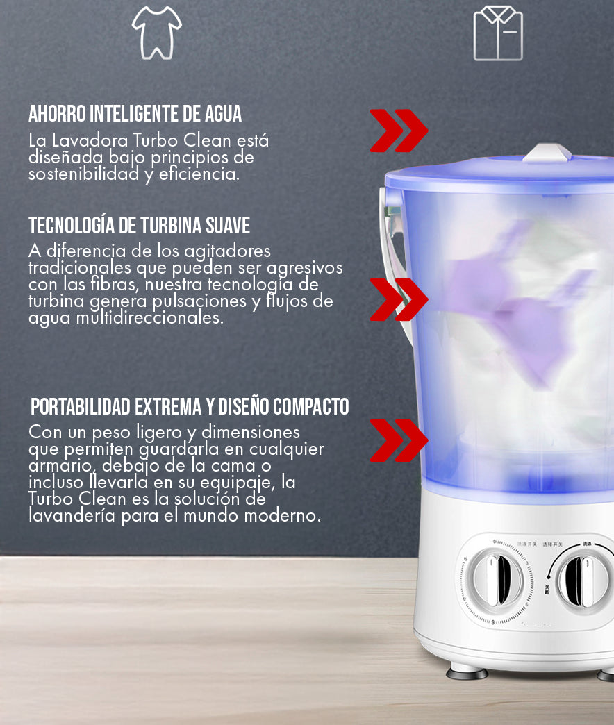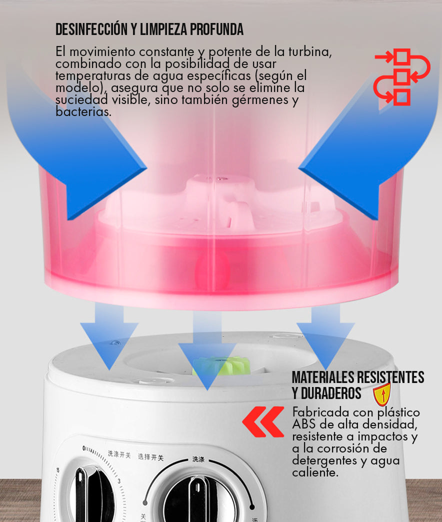 La Lavadora Turbo Clean está diseñada específicamente para prendas pequeñas y delicadas. Esto incluye, pero no se limita a, ropa interior, calcetines, ropa de bebé (babitas, bodies), pequeñas toallas de mano, mascarillas de tela, y artículos de seda o lencería que requieren un trato suave. Gracias a su tecnología de turbina, garantiza una limpieza profunda sin la fricción agresiva de las máquinas grandes, asegurando que las fibras se mantengan intactas y la vida útil de sus prendas se prolongue. No se recomienda para prendas grandes como jeans pesados, chaquetas o sábanas.