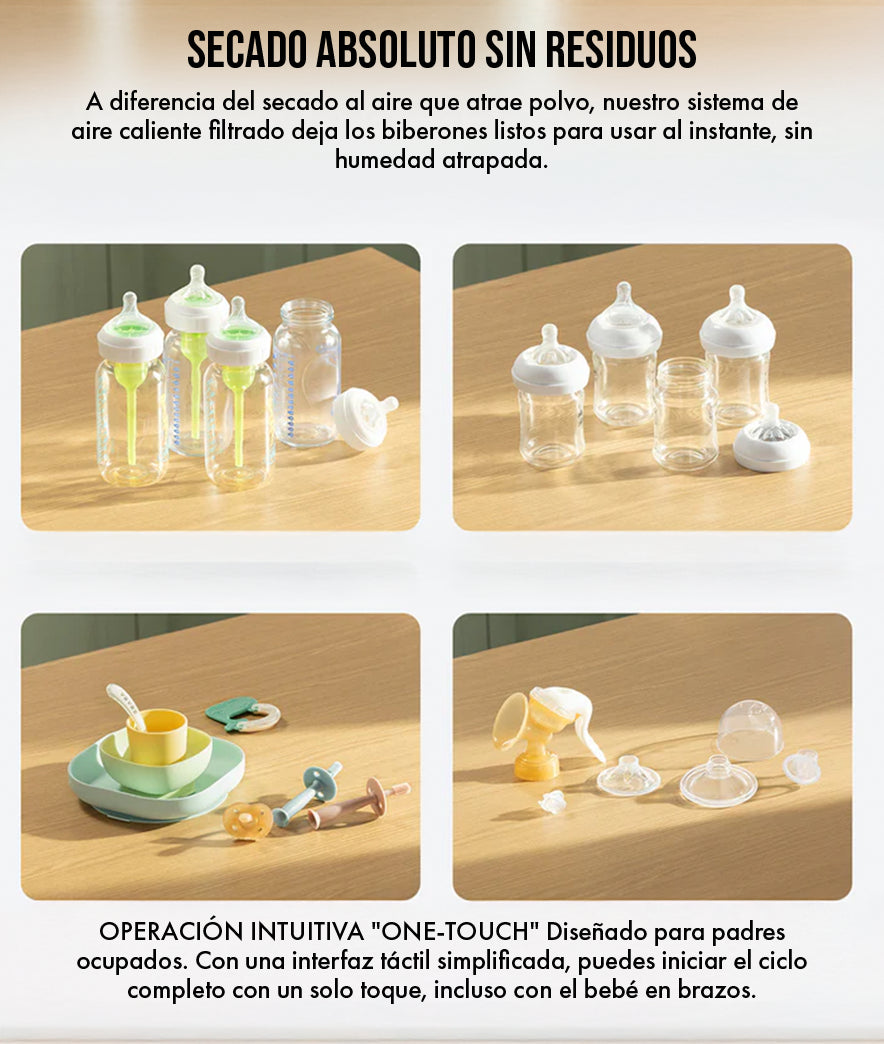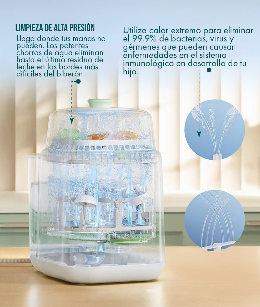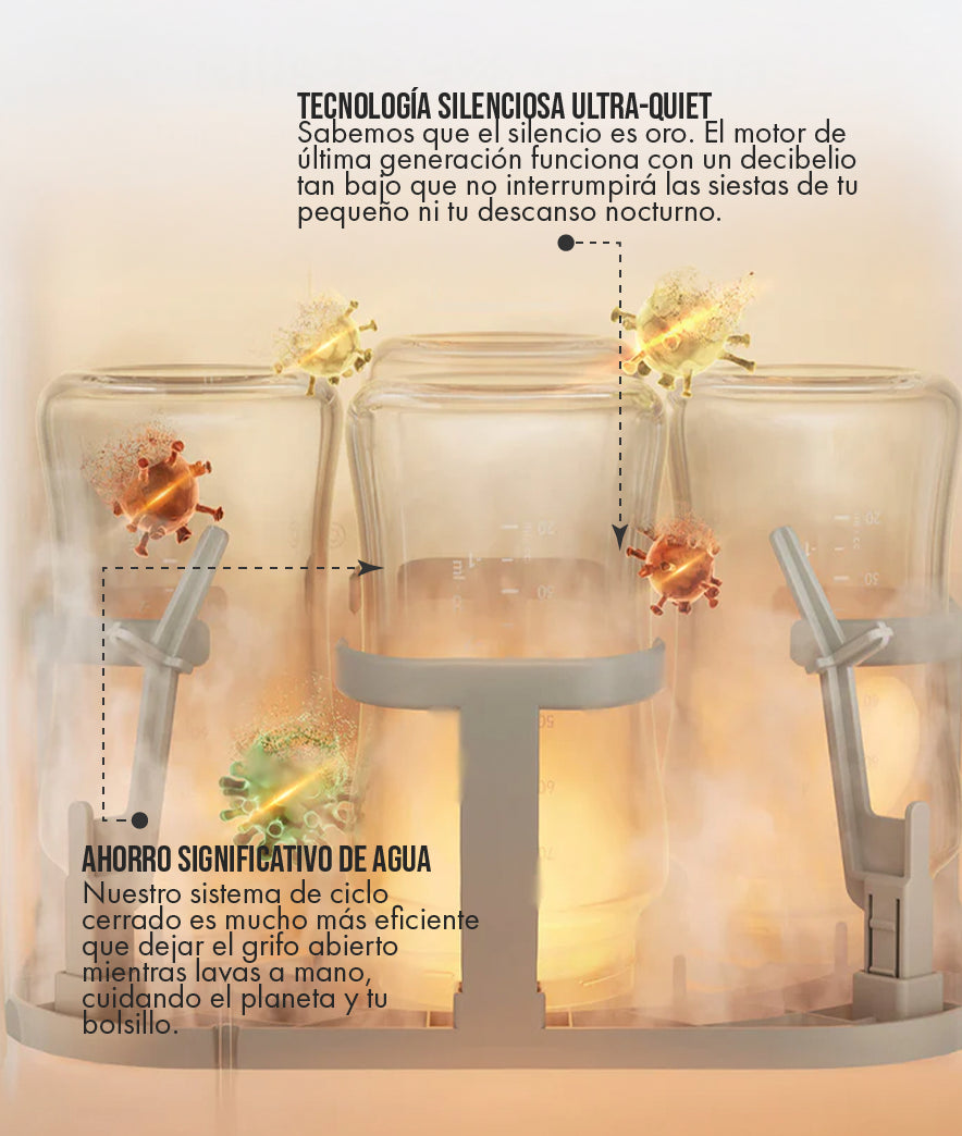 La tranquilidad mental es el mejor regalo. Garantiza que cada toma sea en un recipiente purificado bajo los más altos estándares de higiene hospitalaria en tu hogar.