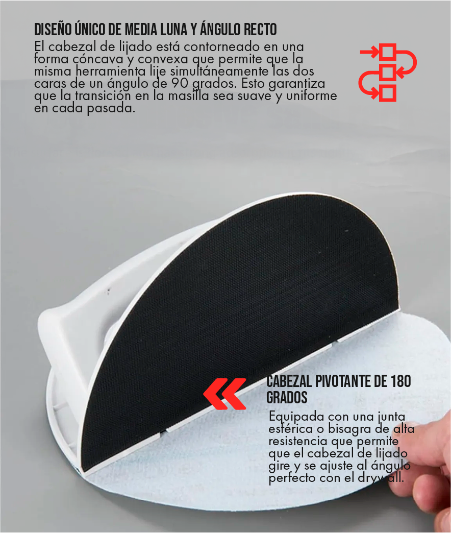 Las esquinas son las líneas divisorias que definen la calidad. Con nuestra lijadora, usted no solo lija; esculpe la masilla con precisión, logrando ángulos rectos definidos y transiciones suaves que reflejan maestría. Deje que sus acabados hablen por usted y cobre lo que vale su profesionalismo.