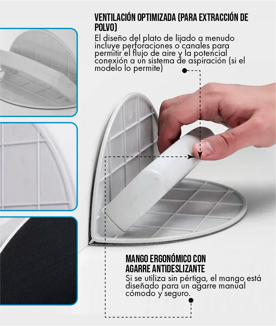 El diseño de media luna lija dos caras simultáneamente, duplicando su eficiencia. Reduzca el tiempo de lijado en cada habitación, acortando los plazos del proyecto y permitiéndole tomar más contratos y aumentar su flujo de caja.