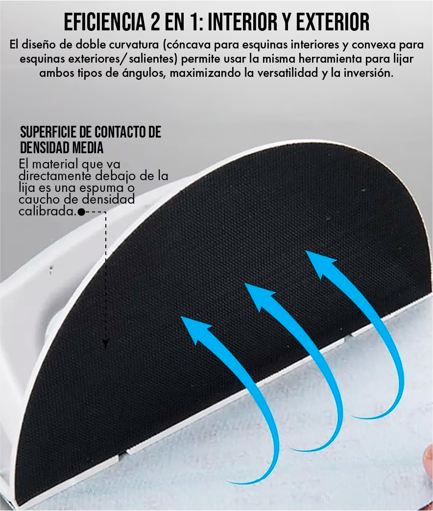 Sí, absolutamente. El diseño de "media luna" o "ala de murciélago" es intencionalmente versátil. La parte cóncava se ajusta perfectamente a la junta interior de 90 grados, mientras que la parte convexa se adapta al ángulo saliente (esquina exterior) protegido por un guardacanto. Es una herramienta 2 en 1 diseñada para abordar la geometría completa de cualquier instalación de drywall.