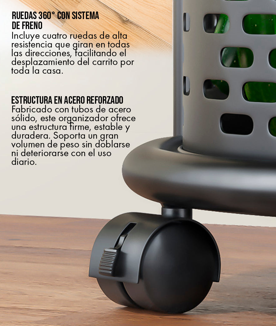Sí, la estabilidad es clave. El mecanismo de giro está diseñado para ser suave y estable, incluso con peso. La torre cuenta con una base robusta y está hecha de acero, lo que le da un centro de gravedad bajo. Las ruedas con bloqueo aseguran que la estructura permanezca inmóvil mientras giras las cestas.