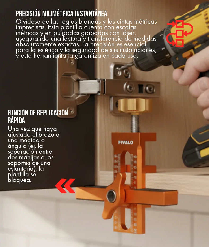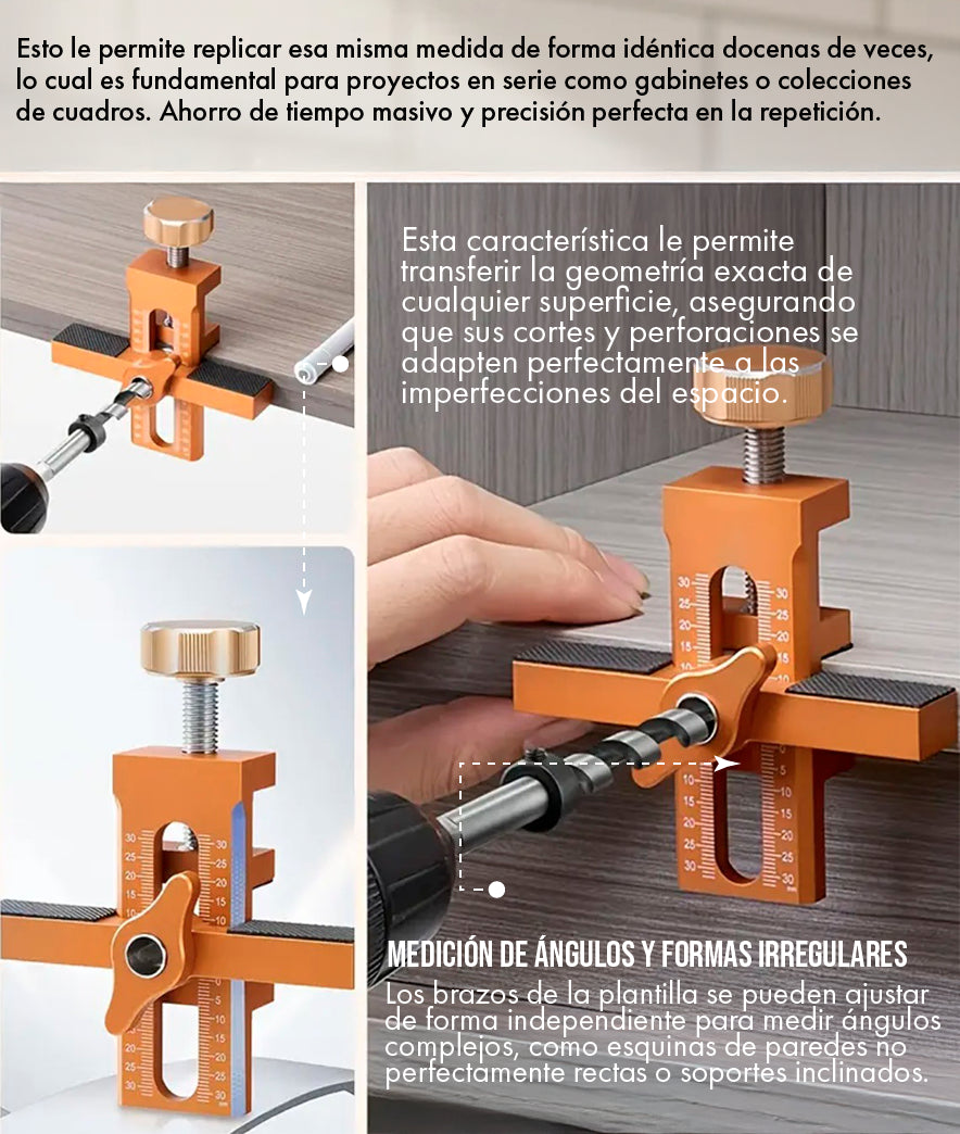 Es indispensable para cualquier proyecto que requiera la repetición de una medida y una alineación perfecta. Es la herramienta de elección para: instalación de gabinetes de cocina (manijas y soportes), colgar estanterías flotantes, montaje de cuadros en serie, instalación de bisagras y tiradores de puertas, y trabajos de carpintería general donde la precisión es primordial. Su capacidad para medir ángulos irregulares también la hace ideal para trabajos de corte en pisos o techos.
