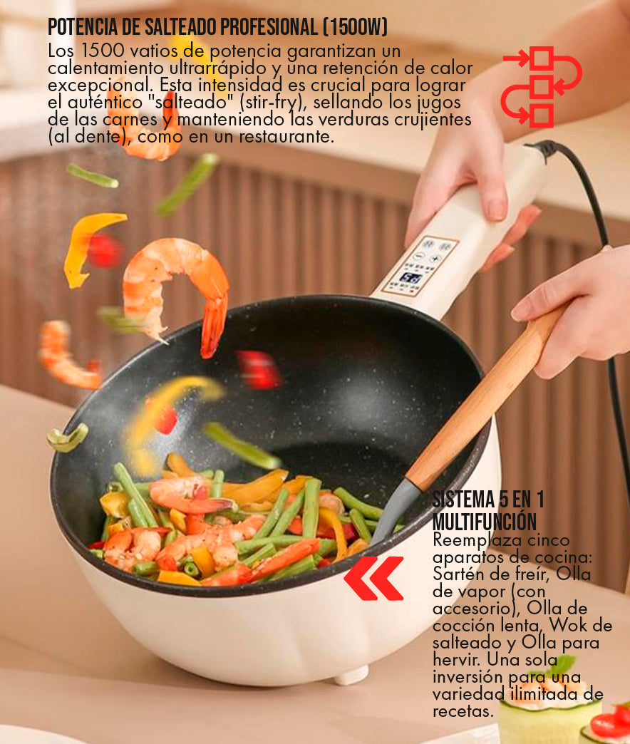 5 en 1 (Saltear, Freír, Vapor, Estofar, Hervir): Reemplaza múltiples aparatos con un solo enchufe. |