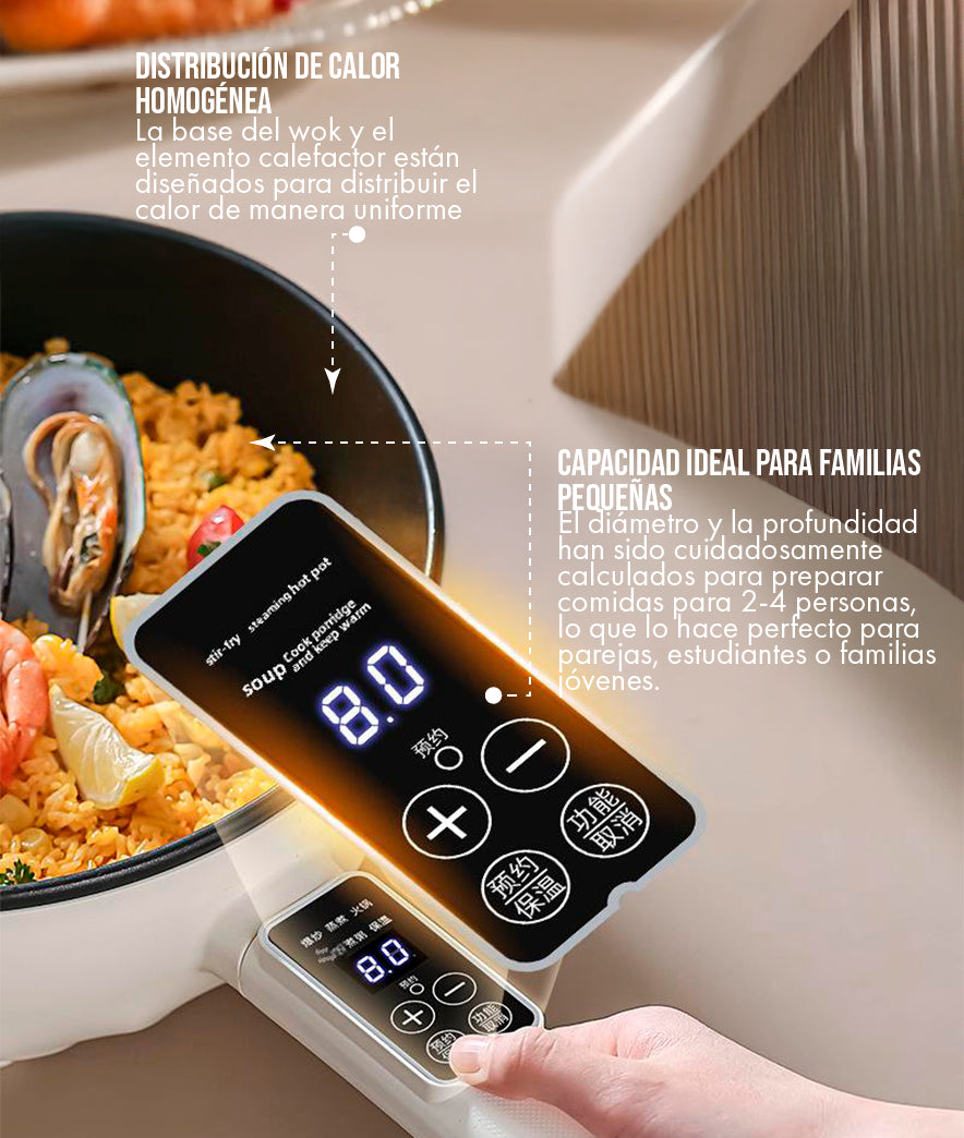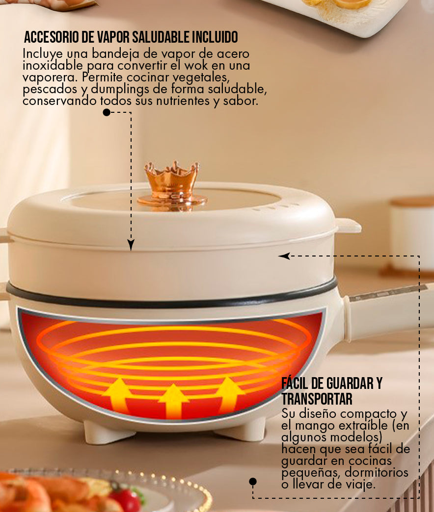 El tiempo es el ingrediente más valioso. Con 1500W, su Wok Eléctrico está listo para saltear, freír o hervir en una fracción del tiempo de una estufa convencional. Recupere sus tardes, ¡cocine con velocidad!