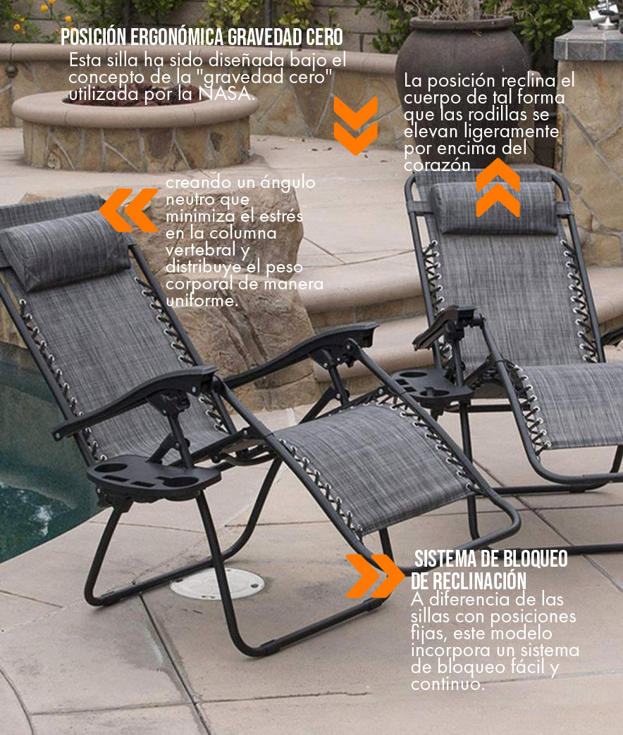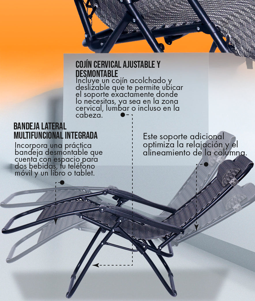 Sí, la posición de Gravedad Cero se logra de forma muy intuitiva. Simplemente te sientas y te inclinas hacia atrás ejerciendo un poco de presión. El diseño del marco y los cordones elásticos facilitan el movimiento suave hasta que tus piernas queden elevadas. Una vez que encuentras tu ángulo ideal, solo tienes que accionar el bloqueo en las palancas laterales para fijar la posición.