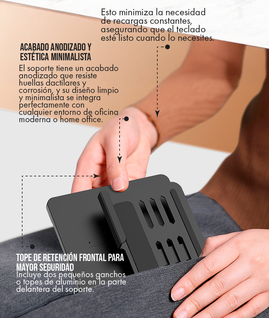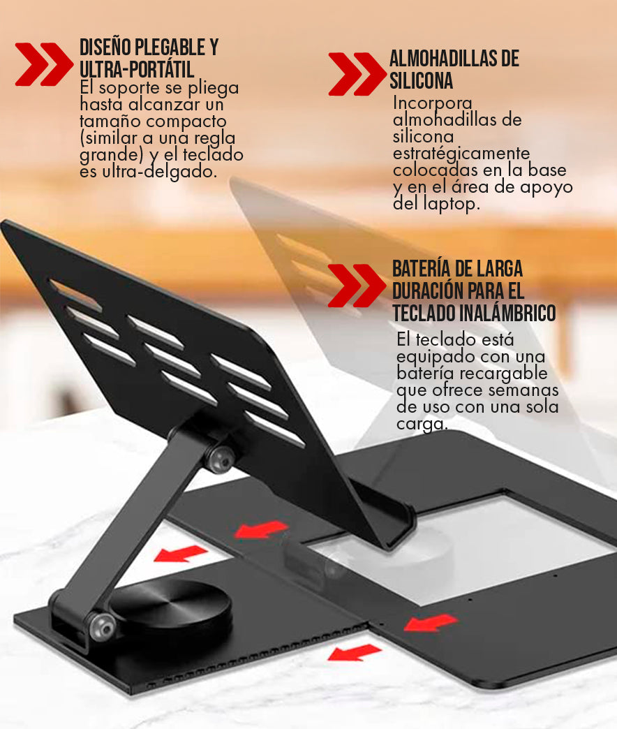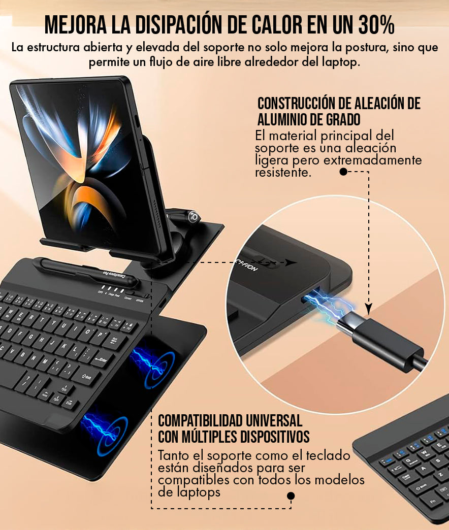 La estabilidad es una característica clave. El soporte está construido con una aleación de aluminio de alta resistencia que garantiza una base firme. Al elevar la pantalla y usar el teclado Bluetooth separado, se elimina la interacción directa del teclado integrado con el soporte. Esto, combinado con los topes de silicona, asegura que su laptop se mantenga completamente firme y sin tambaleo incluso con tecleo intenso.