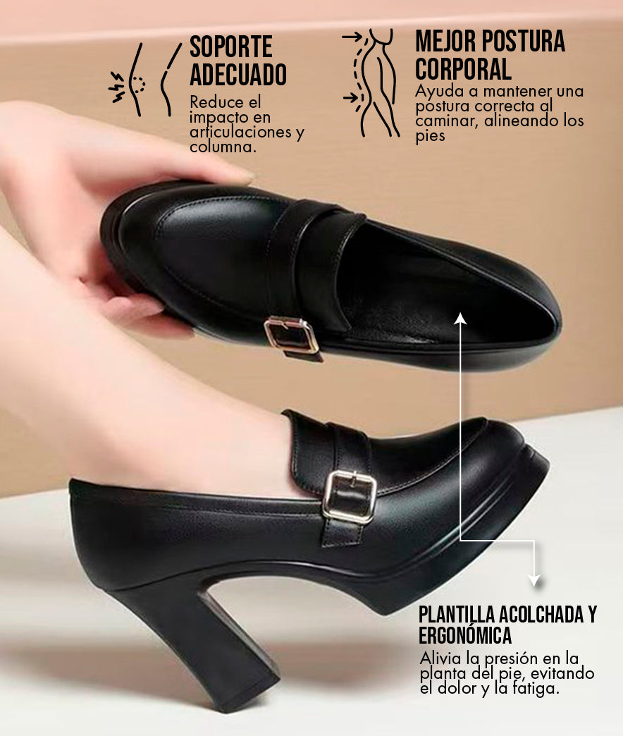 Plataforma Oculta + Tacón Bloque: Reducción de la inclinación real del pie y soporte del peso equilibrado. |