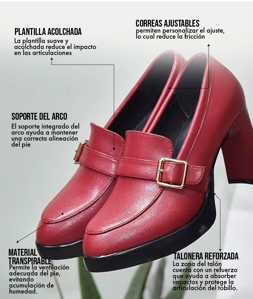 El dolor y la incomodidad ya no tienen que ser un compromiso de estilo. Nuestra tecnología de plataforma amortiguada y tacón de bloque redistribuye la presión, cuidando cada articulación de su pie. ¡Camine más, sonría más!