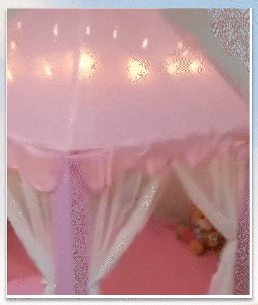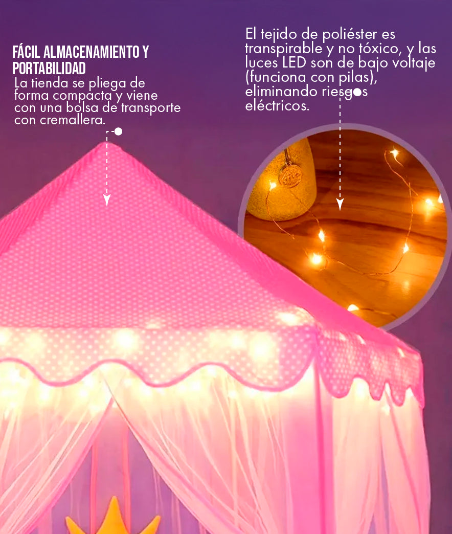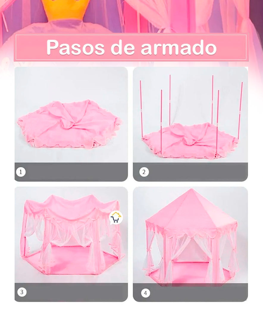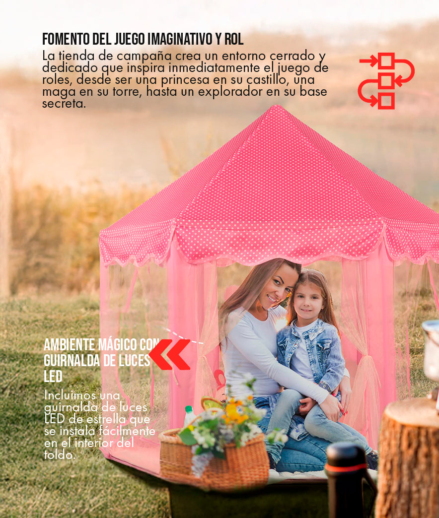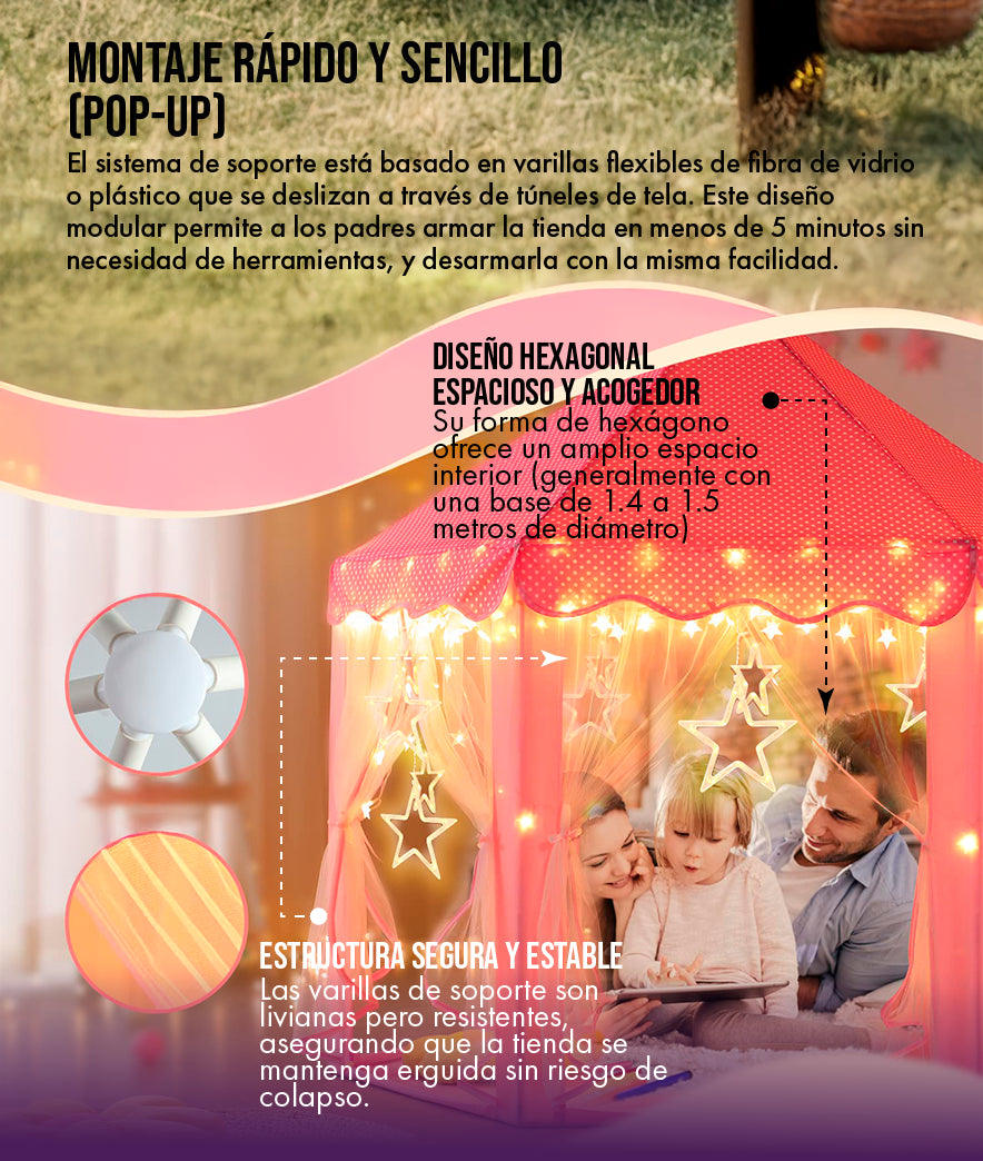 La tienda tiene una base hexagonal de aproximadamente 1.4 a 1.5 metros de diámetro y una altura central de alrededor de 1.3 metros. Está diseñada para acomodar cómodamente a 2-3 niños (dependiendo de su edad) o un adulto y un niño. Es lo suficientemente espaciosa para ser un área de juego sin dominar completamente la habitación.