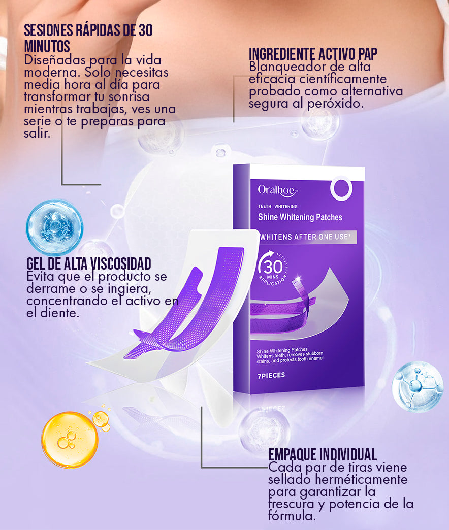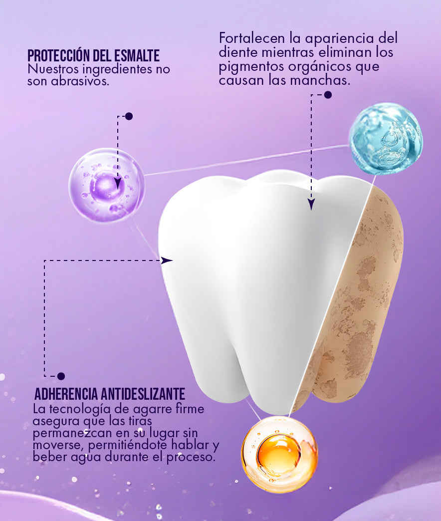 No. Nuestras tiras están formuladas sin peróxido y utilizan PAP+ (ácido ftalimidoperoxicaproico), que es un agente blanqueador no invasivo que no causa desmineralización del esmalte, haciéndolas seguras para uso frecuente.