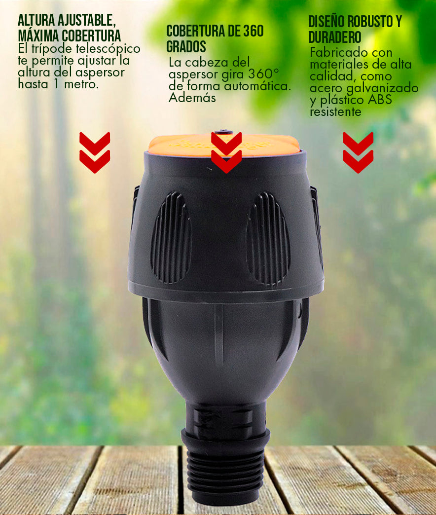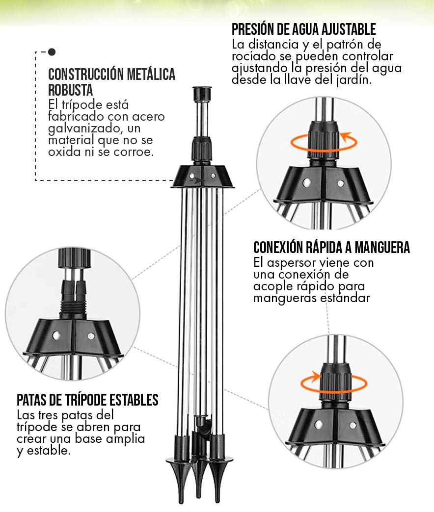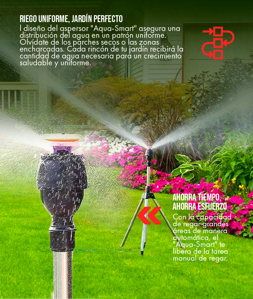 El Aspersor "Aqua-Smart" es un sistema de riego automático que consta de un aspersor de alta potencia montado sobre un trípode metálico y ajustable. Simplemente lo conectas a tu manguera de jardín, lo colocas en el lugar deseado y abres el grifo. El aspersor girará automáticamente para distribuir el agua de manera uniforme sobre un área amplia, permitiéndote regar tu jardín sin tener que sostener una manguera.