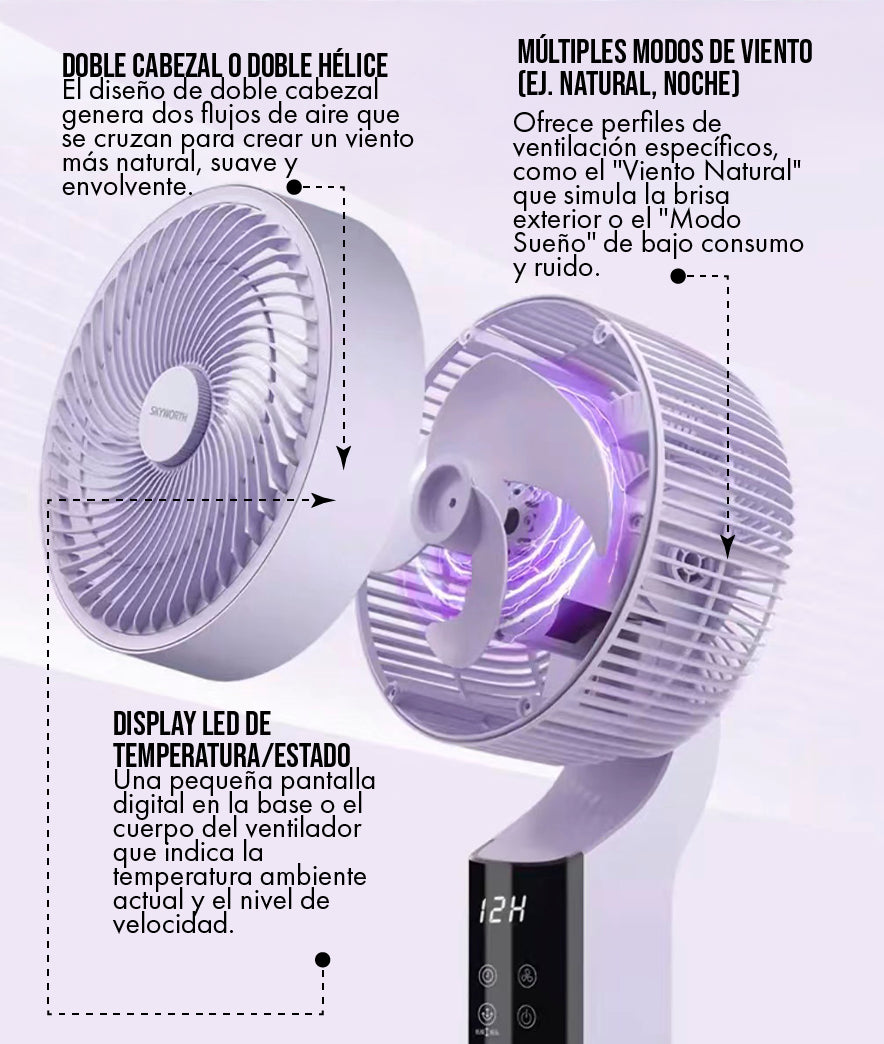 Se refiere a la capacidad del ventilador de moverse y dirigir el flujo de aire en múltiples dimensiones simultáneamente, gracias a la combinación de oscilación horizontal (55° izquierda/derecha) y oscilación vertical (90° arriba/abajo).