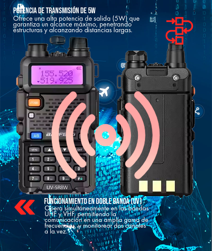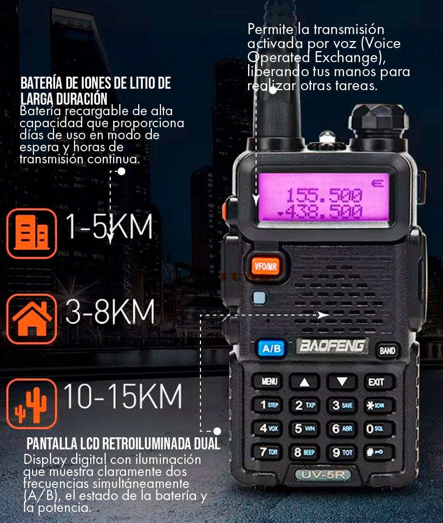 5 Veces Más Potente que Walkie-Talkies FRS: Con 5W de potencia, es cinco veces más potente que los walkie-talkies FRS estándar de 1W (máx).